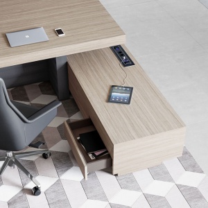 Disponibles en deux versions : bureaux avec joue et fond recouverts en cuir synthétique RENO et bureaux avec joue et fond recouverts en cuir synthétique RENO et retour latérale.