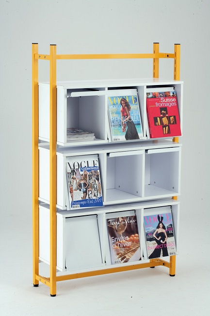 - Meuble présentoir à périodiques, neuf ou douze volets, composé d'un rayonnage métallique simple face en hauteur 160cm, équipé de trois ou quatre présentoirs à périodiques trois volets à insérer.